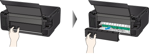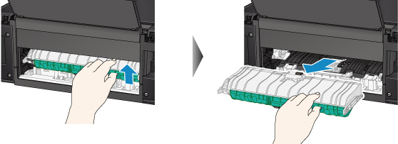 Jeśli wykonanie powyższych czynności nie rozwiąże problemu, otwórz pokrywę tylną i wyjmij papier, postępując zgodnie ze wskazówkami podanymi w części Wyjmowanie zaciętego papieru od tylnej strony.