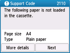 Jeśli ustawienia papieru dotyczące drukowania lub kopiowania są niezgodne z zarejestrowanymi w drukarce informacjami o papierze umieszczonym w kasecie (jak pokazano poniżej), na ekranie dotykowym pojawi się komunikat o błędzie.