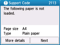 Jeśli zgodnie z konfiguracją źródło papieru ma się przełączać automatycznie, a ustawienia papieru dotyczące drukowania lub kopiowania nie zgadzają się z zarejestrowanymi w drukarce informacjami o papierze umieszczonym na tylnej tacy lub w kasecie (jak pokazano poniżej), na ekranie dotykowym pojawi się komunikat o błędzie.