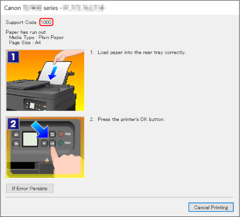 Αν παρουσιαστεί ένα σφάλμα κατά την εκτύπωση, για παράδειγμα, αν το χαρτί εξαντληθεί ή μπλοκάρει, εμφανίζεται αυτόματα ένα μήνυμα αντιμετώπισης του προβλήματος. Για ορισμένα σφάλματα, εμφανίζεται επίσης ένας κωδικός υποστήριξης (αριθμός σφάλματος).