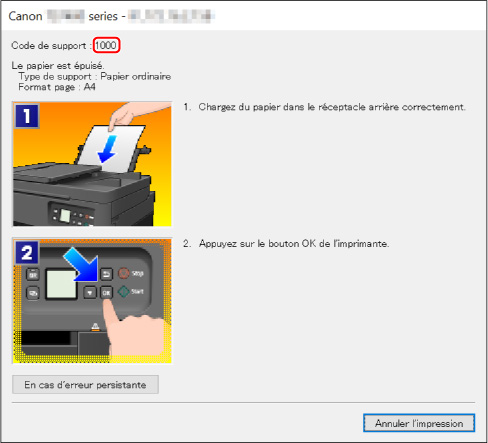 Si une erreur se produit lors de l'impression, par exemple si le papier est épuisé ou coincé, un message de dépannage s'affiche automatiquement. Pour certaines erreurs, un code de support (numéro de l'erreur) s'affiche également.