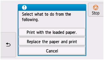 Se l'alimentazione della carta è impostata in modo da cambiare automaticamente e le impostazioni carta per la stampa o la copia non corrispondono alle informazioni della carta del vassoio posteriore o del cassetto impostate nella stampante, come mostrato di seguito, viene visualizzato un messaggio sul touchscreen.