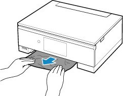 بعد تخزين درج إخراج الورق ودعامة إخراج الورق، اسحب الدرج للخارج ثم قم بإزالة الورق المحشور ببطء بكلتا يديك.