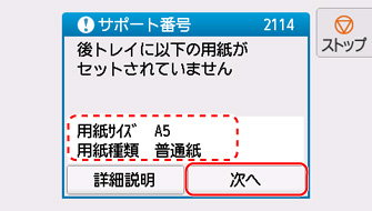 表示されている用紙情報が印刷設定と同じであることを確認したあと、[はい]を選んでください。