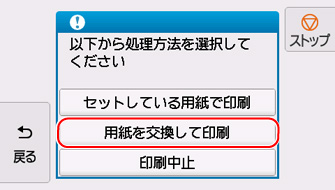 以下の手順で、後トレイにセットしている用紙に適した印刷設定を指定し、印刷/コピーをやり直してください。