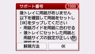印刷中に用紙がなくなる、または紙づまりなどのトラブルが発生すると、自動的にトラブルの対処方法を示すメッセージが表示されます。トラブルの内容によっては、サポート番号(エラー識別番号)も表示されます。