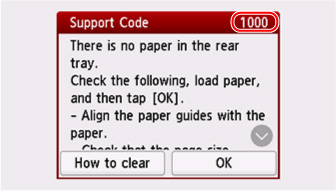 Ha hiba történik nyomtatás közben, például ha kifogy vagy elakad a papír, automatikusan megjelenik egy hibaelhárítási üzenet. Egyes hibák esetén egy támogatási kód (hibaszám) is megjelenik.