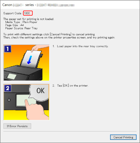 Se si verifica un errore durante la stampa, ad esempio se la carta si esaurisce o si inceppa, viene visualizzato automaticamente un messaggio per la risoluzione dei problemi. Per alcuni errori viene visualizzato anche un codice supporto (numero di errore).