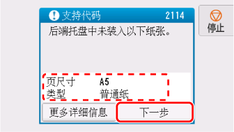例如,在装入后端托盘的纸张与打印机中注册的纸张信息不一致时,要继续打印/复印,请按照以下步骤操作。