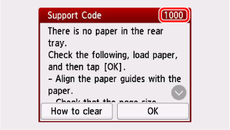 หากเกิดข้อผิดพลาดขณะพิมพ์ เช่น หากกระดาษหมดหรือติดค้าง ข้อความการแก้ไขปัญหาจะแสดงขึ้นโดยอัตโนมัติ สำหรับข้อผิดพลาดบางอย่าง รหัสสนับสนุน (หมายเลขข้อผิดพลาด) ก็จะแสดงขึ้นเช่นกัน