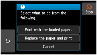 - Selectaţi această opţiune când doriţi să modificaţi setările hârtiei pentru imprimare sau copiere. Modificaţi setările hârtiei şi reîncercaţi imprimarea.