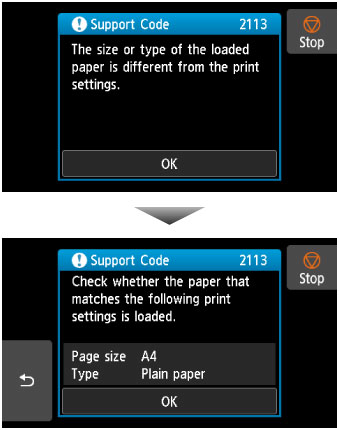 - De exemplu, dacă setarea de hârtie pentru imprimare sau copiere este A5 şi la informaţiile despre hârtia din tava din spate şi din casetă este setată dimensiunea A4, schimbaţi hârtia din tava din spate sau din casetă cu hârtie A5 şi continuaţi cu imprimarea sau copierea.