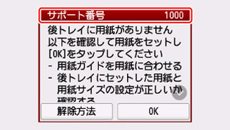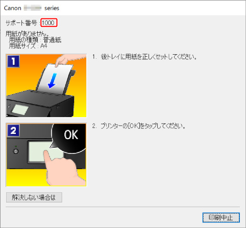 印刷中に用紙がなくなる、または紙づまりなどのトラブルが発生すると、自動的にトラブルの対処方法を示すメッセージが表示されます。トラブルの内容によっては、サポート番号(エラー識別番号)も表示されます。