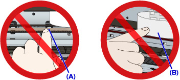 Når du fjerner en hindring for skriverhodeholderen må du passe på at du ikke berører den gjennomsiktige filmen (A) eller det hvite beltet (B).