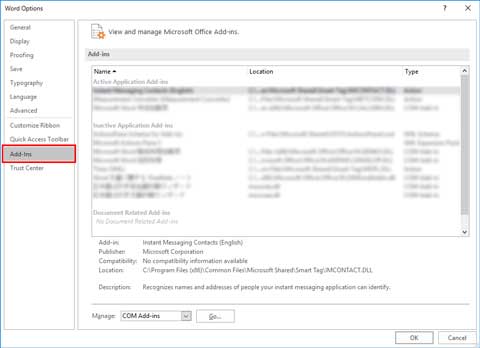 Dall'elenco a sinistra della finestra di dialogo del <nome dell'applicazione>, selezionare Componenti aggiuntivi (Add-ins).