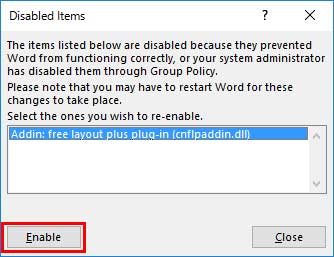 - Se viene visualizzato Componente aggiuntivo: plug-in free layout plus (cnflpaddin.dll) (Addin: free layout plus plug-in (cnflpaddin.dll)) nella finestra di dialogo Elementi disabilitati (Disabled Items), selezionarlo e fare clic sul pulsante Abilita (Enable).