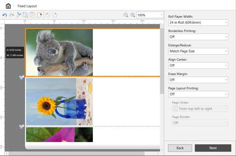 Imposta il layout e la larghezza della carta in rotoli nel momento in cui si verifica l'anteprima dei risultati di stampa.