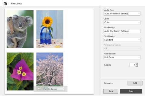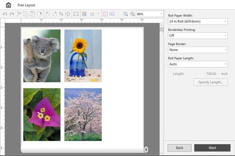 Nella modalità Free Layout, scegliere il layout dei dati da stampare secondo le proprie preferenze sulla carta in rotoli, quindi procedere con la stampa.