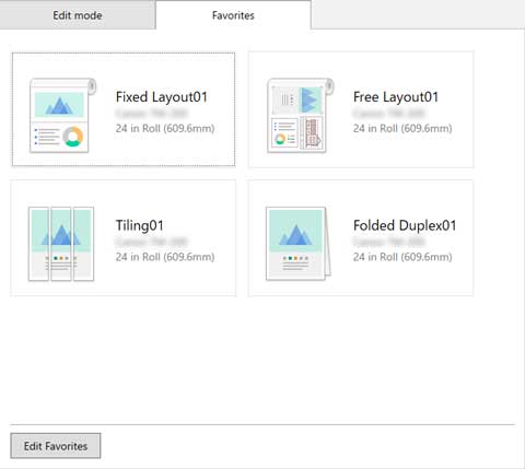 Exibido quando você clica na guia Favoritos (Favorites). É possível selecionar uma combinação de impressora, modo de edição e configurações de edição/impressão registradas com antecedência.