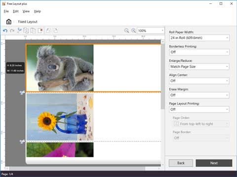 Establezca el orden de las imágenes para imprimir, el Anch. rollo de papel (Roll Paper Width) y otras configuraciones y haga clic en Siguiente (Next).