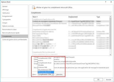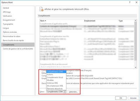 - Depuis la zone de liste déroulante Gérer, sélectionnez Compléments COM