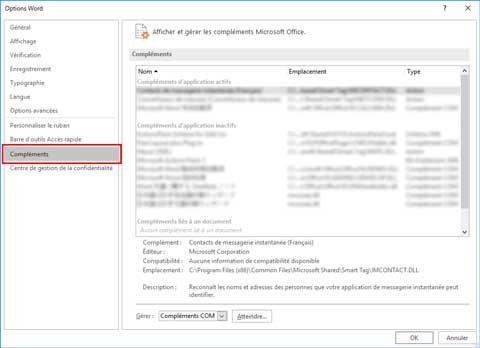 En cas de problème du type interruption anormale du système ou d'une application, l'application Office désactive les compléments par mesure de sécurité.