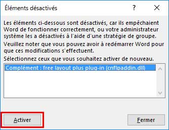 - Si Complément : plug-in free layout plus (cnflpaddin.dll) s'affiche dans la boîte de dialogue Éléments désactivés, sélectionnez-le et cliquez sur le bouton Activer.