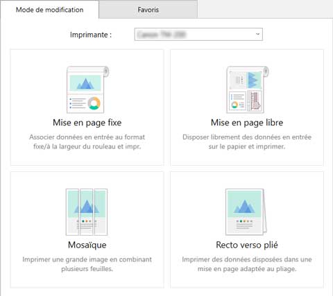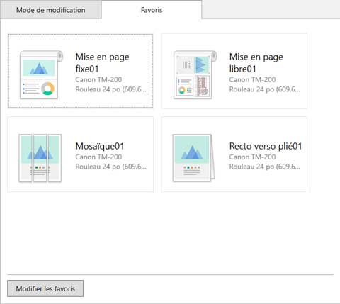 S'affiche lorsque vous cliquez sur l'onglet Favoris. Vous pouvez sélectionner une imprimante, un mode de modification et des paramètres de modification/d'impression enregistrés à l'avance.