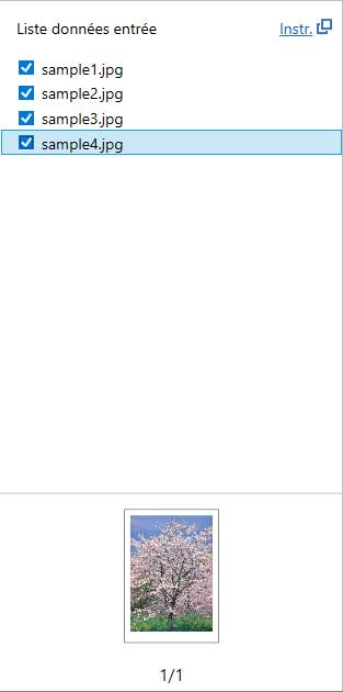 Affiche la liste des données d'entrée et des miniatures.