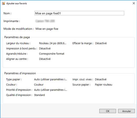Dans la boîte de dialogue Ajouter aux favoris, vous pouvez modifier uniquement le Nom. Pour modifier les paramètres enregistrés, cliquez sur Annuler pour revenir dans le mode de modification. Après avoir modifié les paramètres sur l'écran de modification et l'écran des paramètres d'impression, ouvrez à nouveau la boîte de dialogue Ajouter aux favoris.
