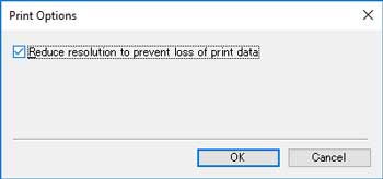 È possibile migliorare i risultati di stampa utilizzando la casella di controllo perRiduci risoluzione per impedire perdita di dati di stampa (Reduce resolution to prevent loss of print data) in Opzioni di stampa (Print Options).