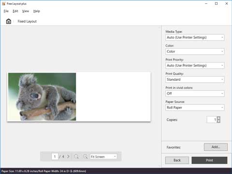In modalità Layout fisso, è possibile scegliere accuratamente il layout dei dati da stampare in base alla larghezza dalla carta in rotolo o secondo le dimensioni carta standard, quindi procedere con la stampa.