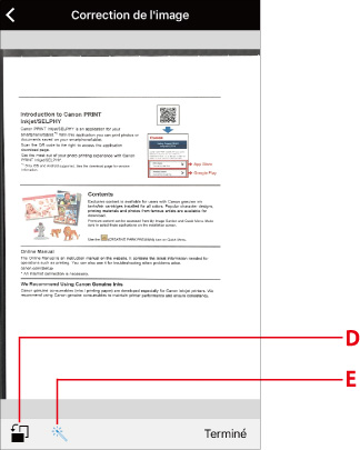 - Touchez pour faire pivoter l'image de 90 degrés. Toutefois, l'image pivote uniquement à l'écran, le résultat de l'impression n'est pas modifié.