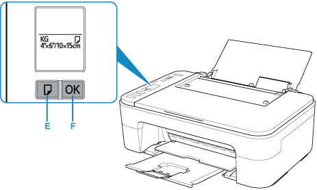 5. กดปุ่ม เลือกกระดาษ(Paper Select) (E) เพื่อเลือกขนาดกระดาษตามกระดาษที่ป้อนในเทรย์ด้านหลัง แล้วกดปุ่ม OK (F)