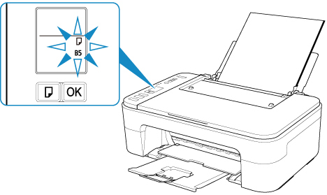 หลังจากป้อนกระดาษในเทรย์ด้านหลัง สถานะกระดาษและขนาดกระดาษปัจจุบันจะกะพริบบน LCD