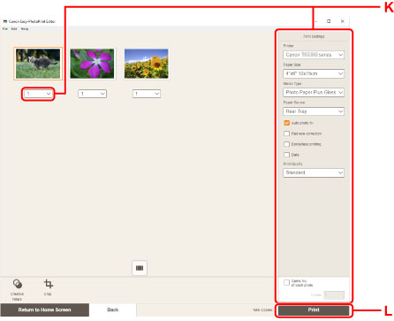 10. Specificaţi numărul de copii şi alte opţiuni din Print Settings (K).