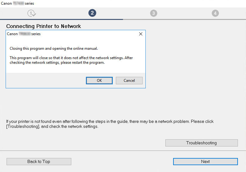 Als de printer niet kan worden gedetecteerd als u de installatie vanaf het begin probeert uit te voeren, gaat u verder naar [Stap 2].
