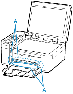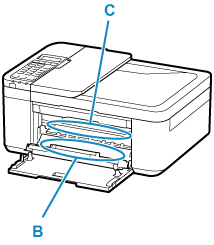 Перед заменой картриджа FINE очистите внешнюю поверхность отверстия для выхода бумаги (A) или внутреннюю поверхность крышки лотка приема бумаги (B) влажной мягкой тканью.