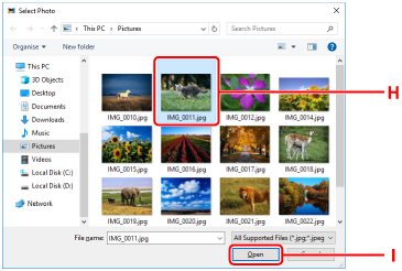 15. Yazdırmak istediğiniz fotoğrafları (H) tıklatın ve (Open) (I) seçeneğini belirleyin.