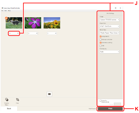 16. Print Settings (J) altında kopya sayısı ve diğer seçenekleri belirtin.