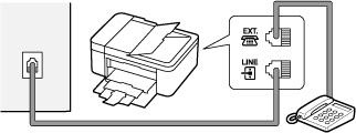 عند توصيل الهاتف بالطابعة، تأكد من إيقاف تشغيل الطابعة، وقم بتوصيل أحد طرفي الكبل المعياري بمقبس الجهاز الخارجي بجوار العلامة "EXT." الخاصة بالطابعة، ثم قم بتوصيل الطرف الآخر بمقبس خط الهاتف الخاص بالهاتف.
