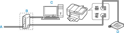 - B: مودم xDSL (قد لا يكون الموزِّع مدمجًا بالمودم)