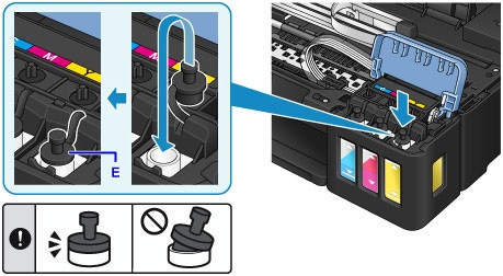 • عند إعادة تعبئة خزانات الحبر، لا تقم بالضغط على جانبي الزجاجة بقوة كبيرة. حيث قد يتناثر الحبر.