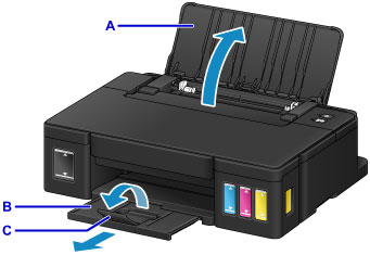 Dra ut utmatningsfacket (B) och öppna sedan utmatningsfackets förlängningsdel (C).