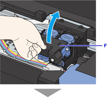Stisnite jezičce i otvorite poklopac za zaključavanje ispisne glave (F).