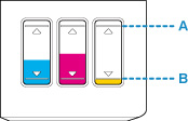 Når blækket er i nærheden af den nedre grænselinje (B), er printeren ved at løbe tør for blæk. Genopfyld blækbeholderen.