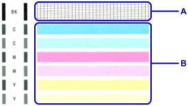 Kontrollér, at der ikke mangler streger i mønsteret (A), og at der ikke er vandrette hvide striber i mønsteret (B).