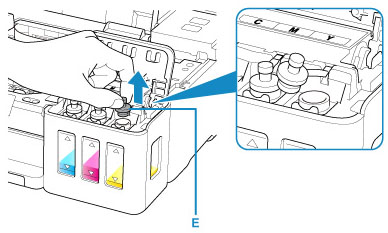 Tartu täytettävän mustesäiliön säiliön korkkiin (E) ja poista se.