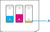 Kontroller det resterende blækniveau med indikatoren for blækbeholderen på forsiden af printeren. Hvis blækniveauet er i nærheden af den nedre grænselinje (A), skal du genopfylde blækbeholderen.