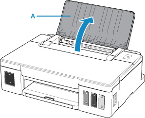 Træk udbakken til papir (B) ud, og åbn forlængeren til udbakken (C).